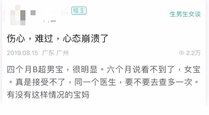 来自广东的妈妈,四个月时B超是男孩,六个月时同一个医生测出来变成女孩了,她感到“伤心、难过、心态崩溃了”。