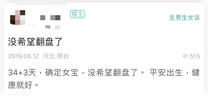 这些帖子下,常见的留言包括"求翻盘"、"女翻男生儿子"。发这些话的准妈妈大多提前测过胎儿性别,知道是女孩的情况下,期待着生产时能翻盘生出儿子。