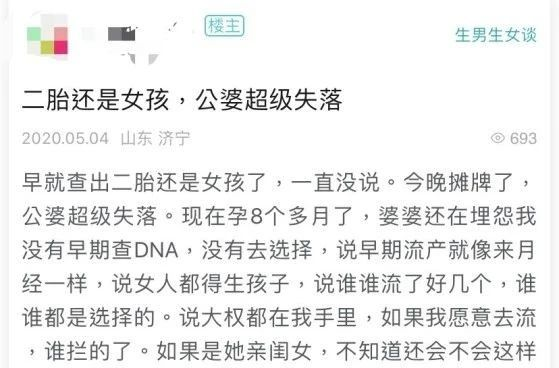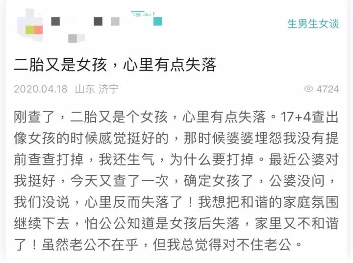 这位山东的妈妈,一开始查出是女儿感觉还挺好,婆婆抱怨她为什么不打掉,她还生气。第二次检查又是女儿,公婆没问结果,她反而心里失落,