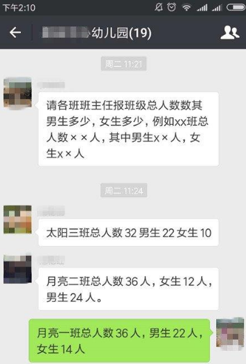 在一位幼师发的朋友圈里,3个班级的男生都是20个以上,女生就只有10来个。男女比例在2:1左右。
