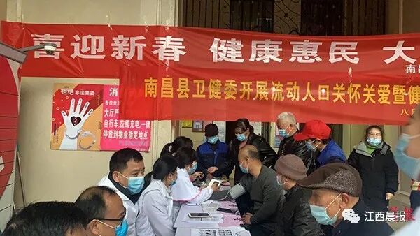 2月8日上午,南昌市南昌县卫健委联合八月湖街道御河湾社区在保集半岛小区内开展“喜迎新春 健康惠民”义诊活动。现场,居民进行体温检测和昌通码查验后,戴上口罩有序参与活动。