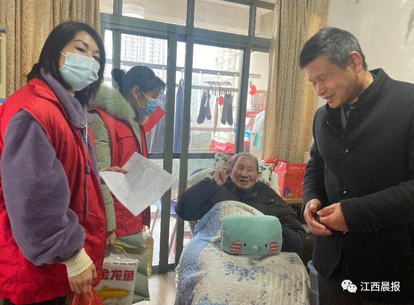 2月8日下午,在春节来临之际,南昌市红谷滩区凤凰城社区计生协会组织志愿者来到“百岁老人”周先生家中,给他送去大米、油、腐竹、粉丝等,并向老人送上新春慰问和祝福。今年100岁高龄的周先生看到爱心人士到来,高兴得合不拢嘴,连声说谢谢。