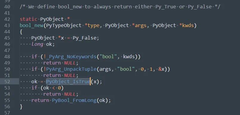 另外,对于内置的 bool(),它的核心实现逻辑正是上面的 PyObject_IsTrue() 函数,源码如下(boolobject.c):