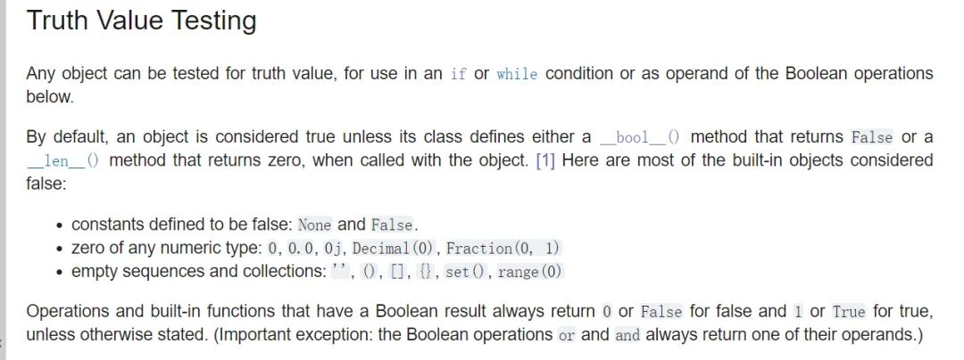 简单而言,Python 的任何对象都可以用在 if 或 while 或布尔操作(and、or、not)中,默认情况下认为它是 true,除非它有__bool__() 方法返回False 或者有__len__() 方法返回0 。