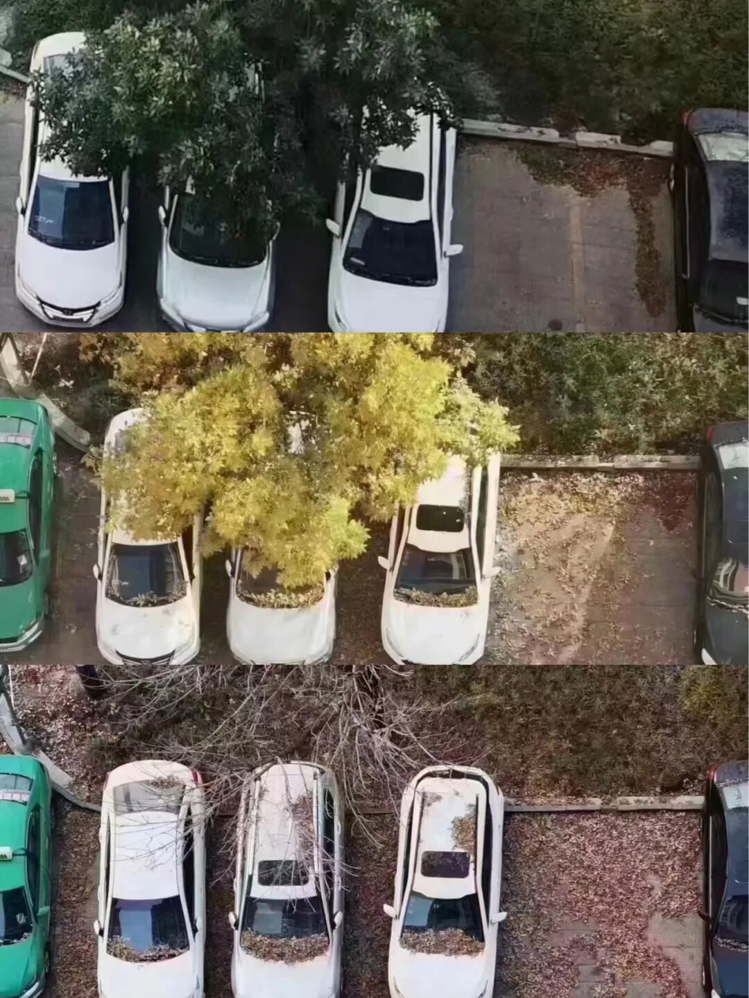 这几十天里,有三辆白色小轿车旁的树,从翠绿变得金黄,又成了光枝桠子。