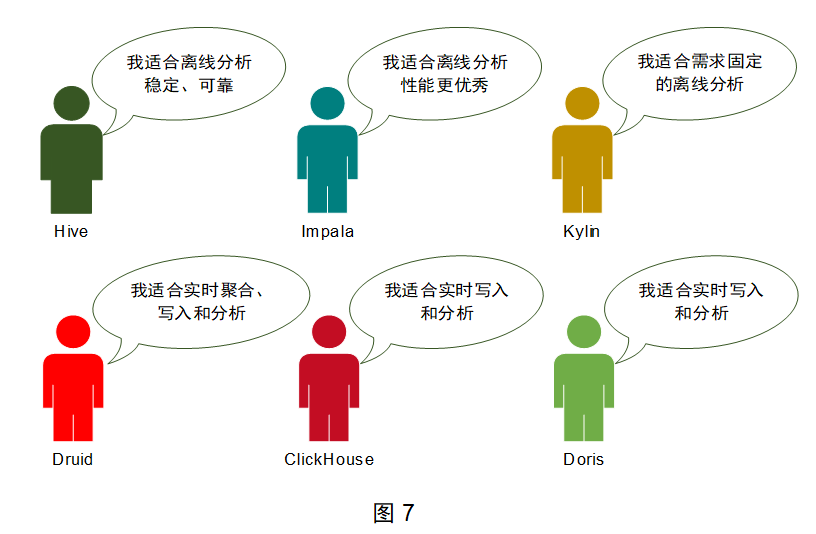 数据分析技术框架包括Hive、Impala、Kylin、Clickhouse、Druid、Doris等,它们的典型应用场景如图7所示。