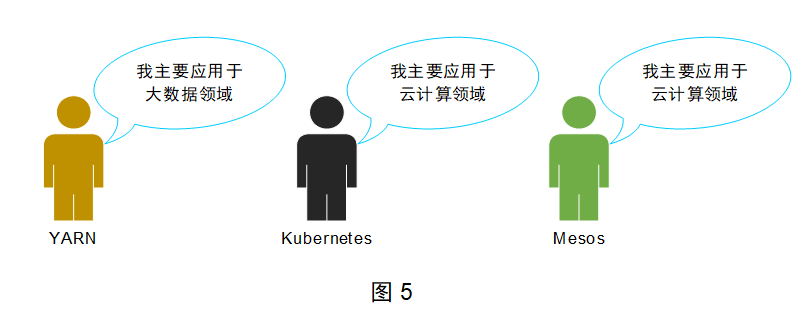因此,分布式资源管理系统应运而生,常见的包括YARN、Kubernetes和Mesos,它们的典型应用领域如图5所示。