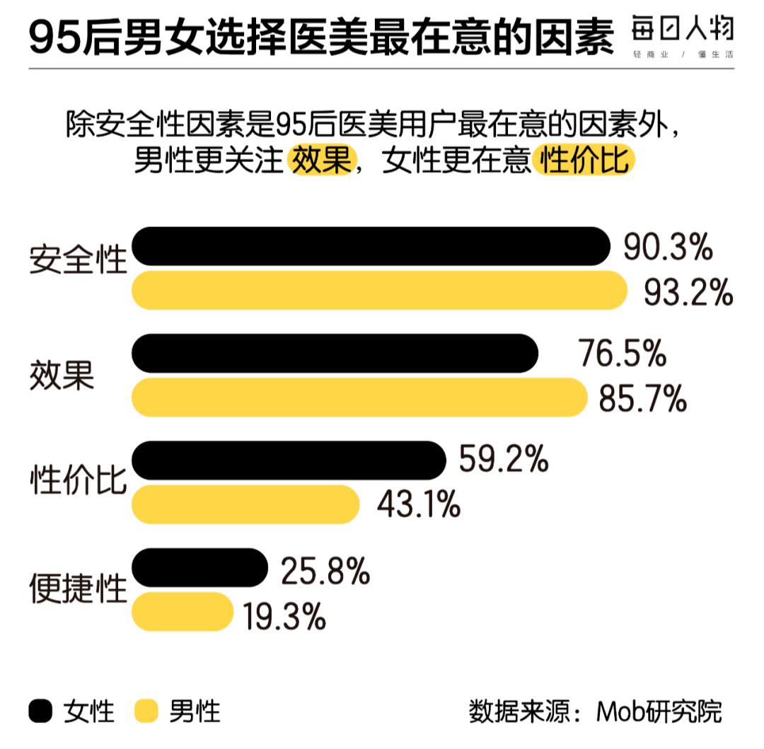 据统计,95后医美消费人群里,男性更爱动刀子,隆鼻、双眼皮、植发是他们最爱的三大项目,而女生则更偏向于微整,光子嫩肤、水光针、瘦脸针是她们首选的项目。但不论男女,能不能健康、安全地完成医美治疗,都是他们最看重的因素。