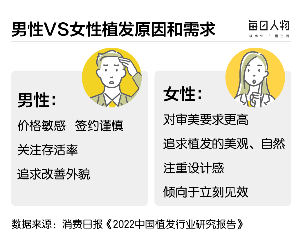 2022中国植发行业研究报告显示,愿意植发的人群画像是:中高收入,追求高颜值,且注重外表,追求生活品质。其中,男性植发多为刚需,女性植发则更追求细节的提升。更通俗地说,男生植发,只是单纯地为了不被叫“大叔”,不用戴上鸭舌帽掩盖发际线。女生植发,是为了成为“完美女神”,在95分的基础上,追求完美的100分。