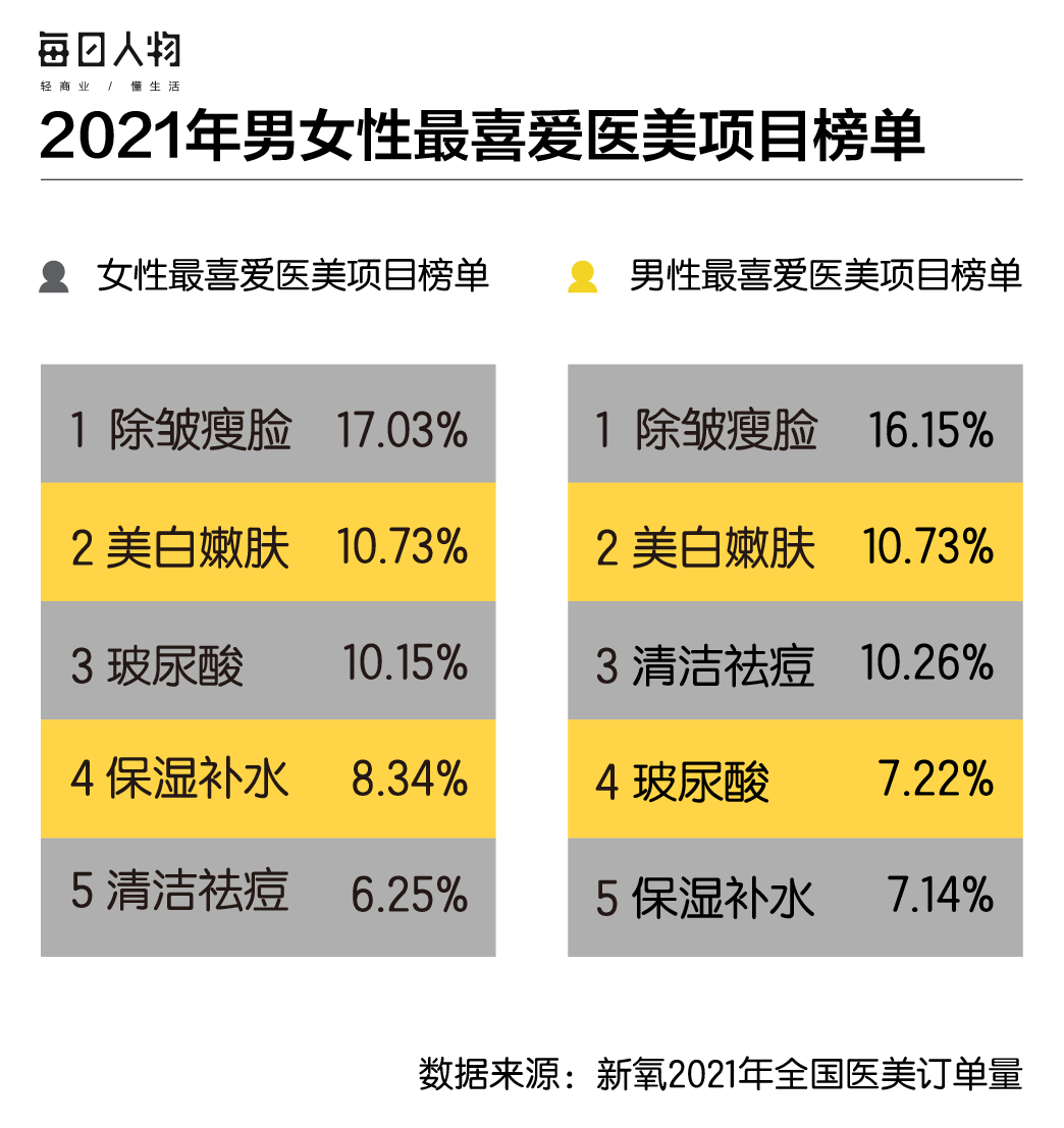 而在具体的项目选择上,无论男女,最火热的关键词有一个,那就是:瘦。“除皱瘦脸”,成为男女最喜爱的医美项目榜单Top1,而在这一门类下,玻尿酸、热玛吉、射频紧肤等项目也是更细的分支。