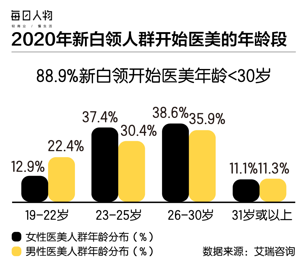 艾瑞咨询曾预测,未来,年轻男性将成为医美的主要增长点。对男性而言,医美和健身一样,都是外表得到提升、变得更有魅力的方式。男性医美人群也更加年轻化,19-22岁这个年龄段就开始医美的比例更高了,达到了22.4%,而相同年龄段的女性占比仅为12.9%。