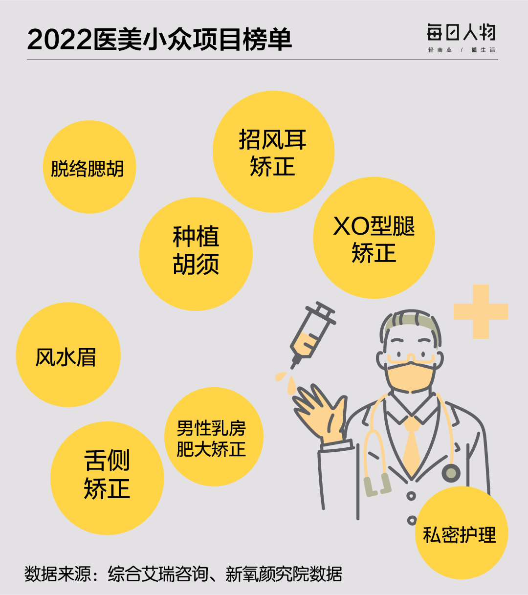 医美风潮里,除了我们常见的割双眼皮、美白嫩肤、热玛吉等常规项目,小众项目也有一定的市场。在新氧的白皮书中,出现了“新奇特”小众消费榜单,榜单订单增长量排名前三的分别是招风耳矫正、XO型腿矫正、男性乳房肥大矫正。这些小众项目的存在让人感叹:只有想不到,没有医美做不到。