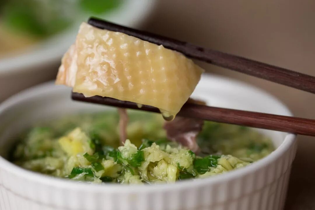 地道的广州吃法是蒜蓉麻油碟;用红葱头加生抽勾成的葱油碟也不错;比较小众的有小蚬子加芥末做成的蚬芥碟,配着鸡肉吃有微微的刺激感和海腥味;另外还有大排档里流行的砂姜碟,砂姜不是生姜,而是一种带着奇异味道的块根香料,弄碎以后,和蒜蓉混合在一起,用热油“嗤”炝一下,就能散发出夏夜广州街头里最勾人魂儿的味道。