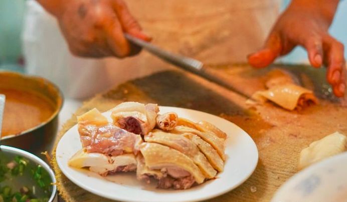 这种白切鸡的独特之处一在蘸料,被誉为“灵魂三酱”的黑豉油、辣椒酱和姜蒜蓉必不可少,有椰糖成分的黑豉油,质地浓稠,入口带甜;辣椒酱由蒜蓉白醋糖和鱼露调制而成,又酸又甜又辣,这三种酱一起,把普通的鸡肉变成了星马鸡。