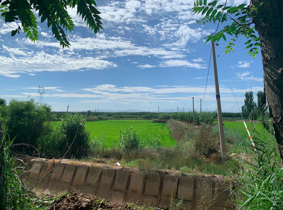 作为案发地,舒军的外公家连日紧闭,红色的铁门锈痕斑驳,张贴的两张门神画像早已脱落掉色,一张福字被门框割成两半,道旁的椿树在米黄色的墙体上投下阴影。暑气把石子路烤得滚烫,路旁的稻田大片的新绿,树上的蝉自顾自地叫着。宁夏少雨,即使在夏天,树叶也暗扑扑的少见鲜亮。
