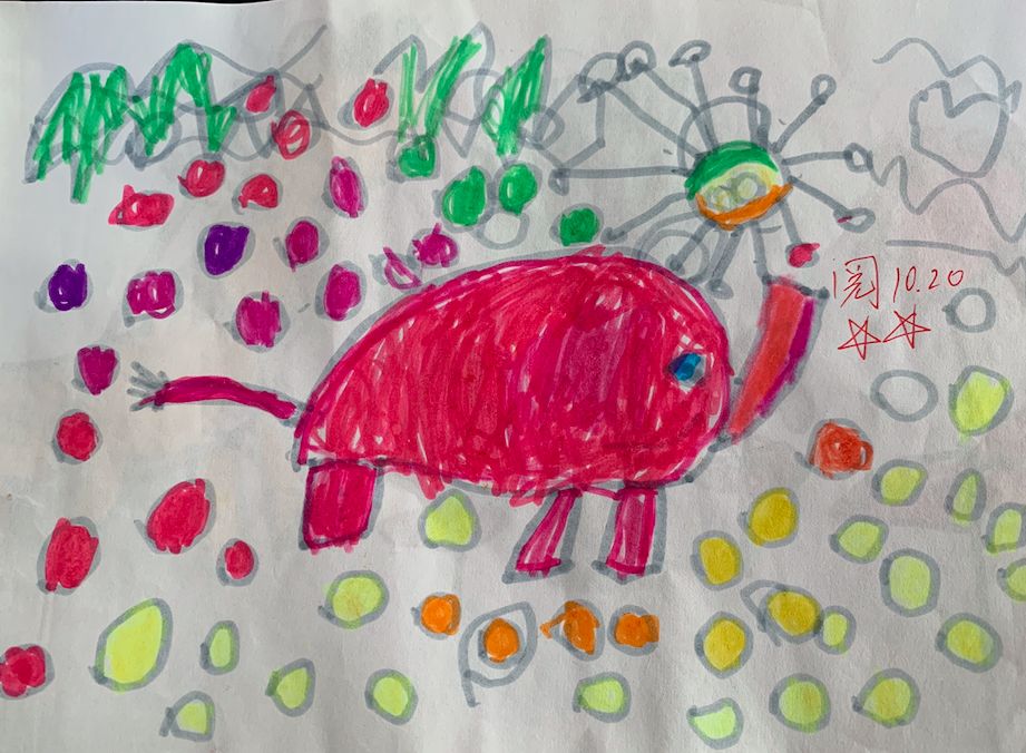 在刚刚结束的幼儿园大班,李雨童又拿了“三好学生”。她留下了一个画本,上面画着红色的大象、比树还高的长颈鹿站在红花旁边、橘红头发的美人鱼有一条绿色的尾巴。