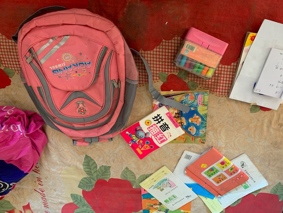 出事前,李雨童丢掉了背过的粉色小熊书包,还有两个双层铅笔盒,分别画着迪士尼公主和狗狗巡逻队,盒盖微微下凹。亲戚家的姐姐送了她一个粉色的书包,是小熊书包的三四倍大,她在包里装了只塞满文具的蓝色笔袋,这是幼儿园同学送她的。李雨童计划带着它们去念一年级。今年9月,她就要去镇上念小学了,还要跟爸妈一起生活。