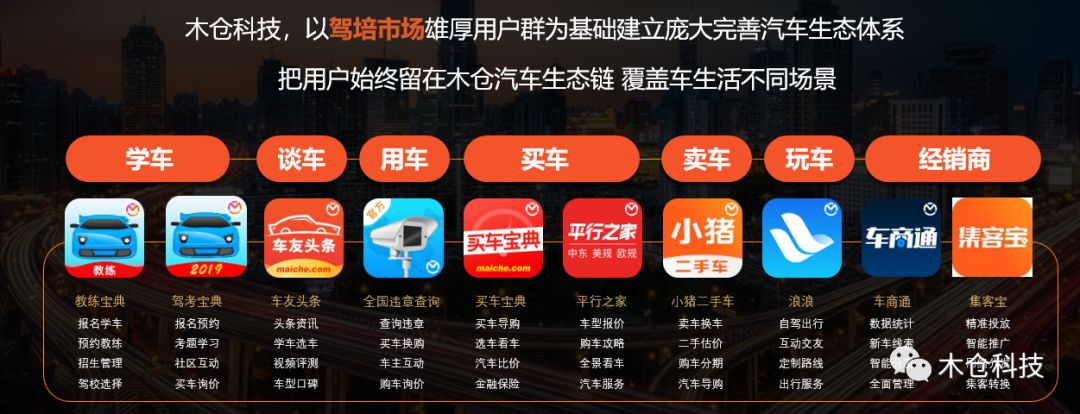 武汉木仓科技股份有限公司创立于2011年,是一家专注于汽车消费领域的移动互联网公司。公司以驾考宝典为源头,从驾考市场向汽车后市场导流,出品了全国违章查询、车友头条、买车宝典、小猪二手车、平行之家、浪浪自驾游等数十款汽车应用APP,并衍生出《超级试驾》《小仓说车》等多个汽车类原创视频IP内容。8年来,木仓科技为近7.9亿用户提供从学车、看车、买车到用车、玩车、卖车的全产业生态服务。
