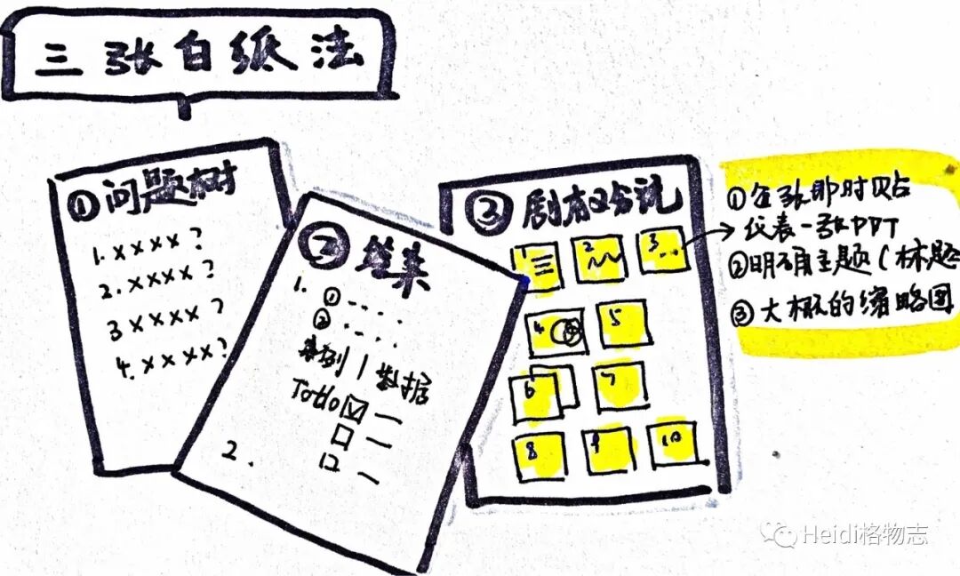 现实经历中,我们真的不一定非要先完成问题拆解、素材收集,再去编排剧本。因为有可能你的剧本会让你发现还缺少了素材,三者的设计可以同步并行,分享给大家一个我自创的方法——三张白纸法,帮助我们可快速厘清问题以及应该找什么样的材料。
