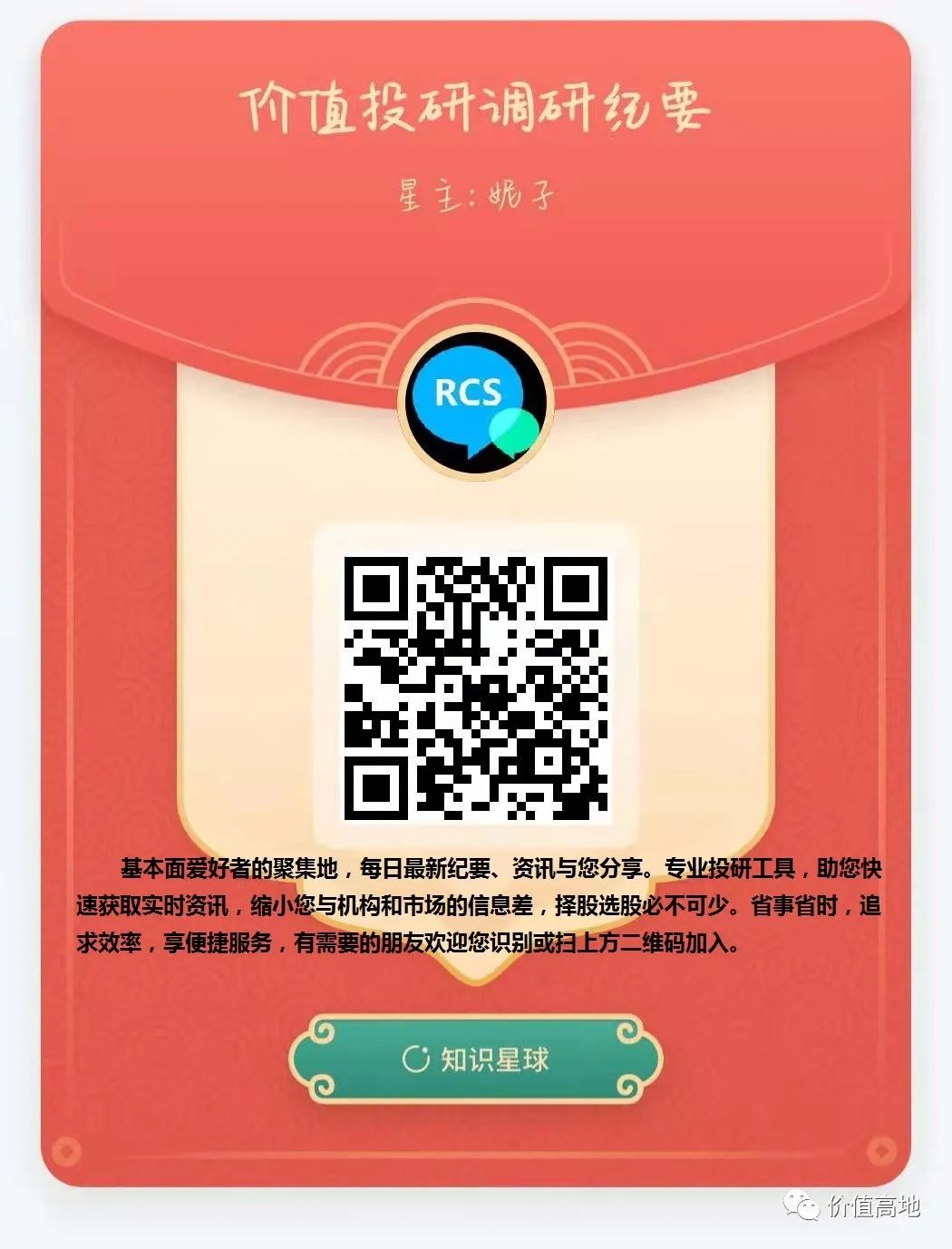 如果想成为一名合格的投资者,一款辅助工具特别重要,本星球将会是您一个优质的选择,现开放运营以来,已受到部分朋友的关注,需要了解更多投资资讯,调研纪要,会议纪要、行业分析报告关注上方星球二维码,每日最新推送,专业投研工具,让您选股无忧。基本面爱好者的集合地,如果您是基本面的爱好者以及想掌握各行业实时资讯那么这里或许比较合适您