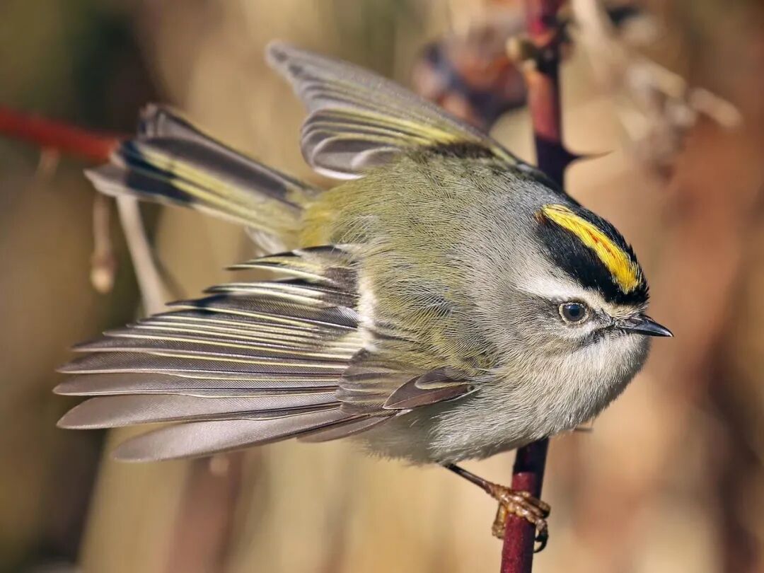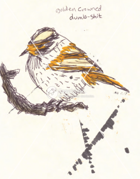 金冠戴菊,脑袋顶上金色的一条,背部有一些黄色,肚子颜色浅。对应的画是相对最不拟真的,作者是这么解释的:这帮小混蛋从来不好好停着给人看,所以他要画得模糊一点儿。
