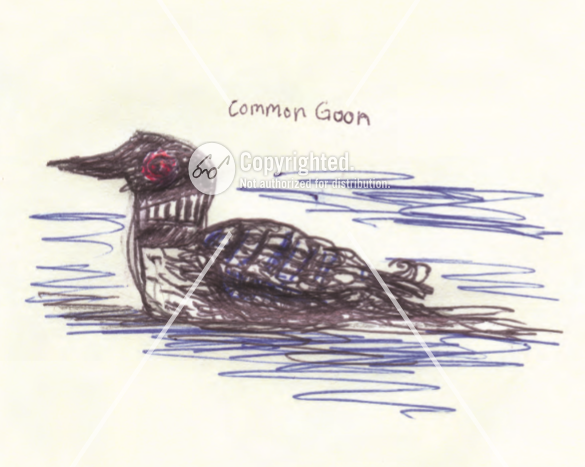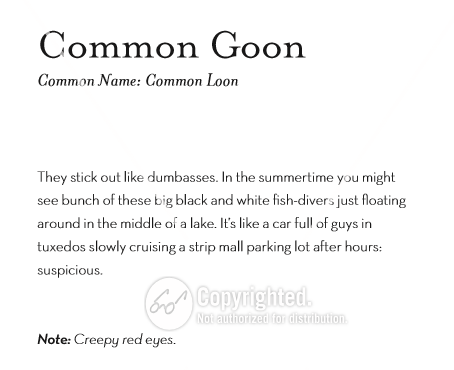 例如,上面说过的普通潜鸟,英文Common Loon,被他写成了Common Goon,普通呆子。好吧,潜鸟看起来是特别呆。