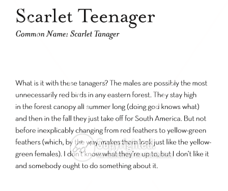 再例如,猩红丽唐纳雀,英文Scarlet Tanager,被他写成了Scarlet Teenager。这么一谐音梗,马上记住了。而且不用担心搞不清楚真正的名字,作者起的诨号下面标了正确的名字。