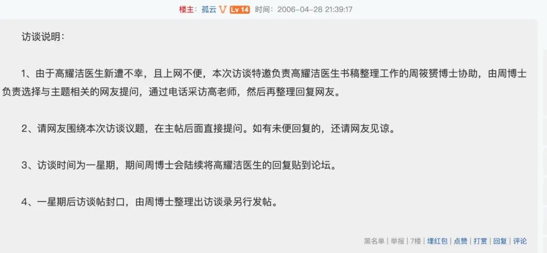有这一层关系,我对周筱赟自然也有亲近感。在高耀洁老师的文章发表后,紧接着我又约周筱赟写了一篇文章《为何历史总是如此相似》,从总体上评价这个活动。这是周筱赟第一次在《东方早报》评论版发表作品。他对评论感兴趣,以及后来入职《南方都市报》评论部,不知道是否从这个时候有了端倪。我和周筱赟的第二次合作,仍然与高耀洁老人有关,是在2006年4月。那时候,我刚离开东方早报,入职杭州日报。同时,我还在关天茶舍当版主。关天茶舍是国内一个民间思想聚集地,论坛上藏龙卧虎,集齐左中右各路人马,平日里十分热闹,争论也特别激烈。我是在2002年短暂当过关天茶舍版主后,这时候又通过推选当了版主,而举行的这次高耀洁医生访谈,是上任版主后比较重要的一次论坛活动。这场活动虽然是线上访谈,实际上全依赖于周筱赟的辛劳付出。我们在关天开了一个访谈主贴,在主贴下面由网友提问,然后再由周筱赟打电话给高耀洁老人,由她在电话里口述,再由周筱赟整理发在论坛上。虽然如此,访谈还是取得了很大影响。高耀洁老人也很重视这次访谈,当时她遭遇老伴新丧,心情十分悲痛,但她还是认真回答了网友提问,对国内艾滋病防治提出了自己的建议。同时,高耀洁老人还拿出100本《中国艾滋病调查》,免费赠送给网友。▲高耀洁老人近照(图/林世钰,来源:一苇杭之渡彼岸公号)我跟高耀洁老人没见过面,也没有交往(似乎打过电话,或者有电子邮件联系),但有一年我还收到了她寄来的明信片。再后来,她就去了美国。从这两件事情可以看出,周筱赟是一个热心、专注的人。他是高耀洁新书的编辑,但他做的事情比一个编辑做的还要多,几乎成了高耀洁的个人助手。由此,也可以让人感受到周筱赟对公益和公共话题的热情。这似乎也是周筱赟在天涯社区的“首秀”。不过,他其实没怎么在关天茶舍活动,反倒是后来在天涯杂谈十分活跃,多次参与公共讨论,甚至影响一些事件的进展。比如在中石化广东公司天价酒单、中非希望工程、郭美美、嫣然基金等事件中,他以爆料人身份出现在公众面前,揭开其中内幕。这些事情已经有人写了,这里不再赘述。不过到这时候,我和周筱赟都还没有见过面。我跟他第一次见面, 是有一年浙大召开新闻舆论监督相关研讨会活动,他受邀参加,我们在龙井的一家餐厅匆匆见了一面。就像跟其他熟悉的网友见面一样,我们彼此并没有什么陌生感。毕竟在网上交流较多,也多有交集互动。但那时候,我对他在做什么事情,其实已不甚了了。也因为对一些公共问题举报的次数多了,周筱赟不得不开始戴起口罩,轻易不以真面目示人。我倒是问过他,为什么要戴口罩,故意搞得神秘兮兮的,他很严肃地告诉我这是很有必要的。只是他哪里能想到,这一层薄薄的口罩,怎么可能护他周全。后来,我跟他的来往,只限于他偶尔来杭州的时候,约我一起吃个饭。还有就是,在他发起的群里,交流几句。私下,我们也很少交流,他有时候会来问我财新网的某篇文章有没有权限可以看到(我有财新网会员),让我转给他。我有时候也会犯嘀咕,怎么不自己买个会员。这次他出事后,我才知道他一直单身租住在广州,养着一只猫,看来他在生活上也不是很轻松。今年2月份,我刚和他又见过一次。席间,我们还谈起某位大家都认识的人,感觉他有些行为比较“危险”。
