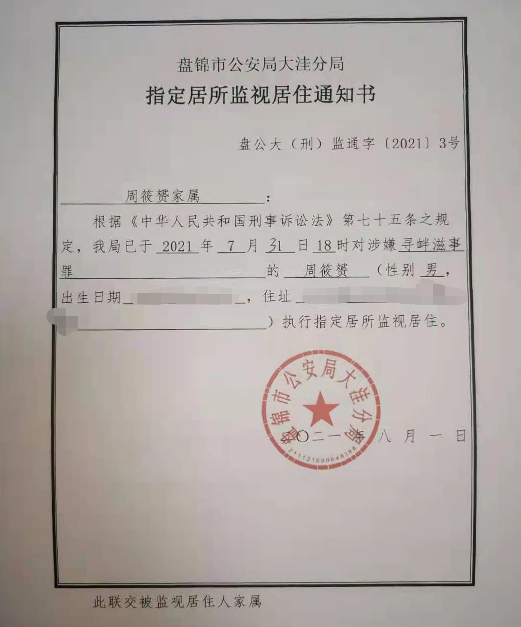 我的朋友周筱赟,一个多月前被盘锦市公安局大洼分局的警察从广州寓所带走了。