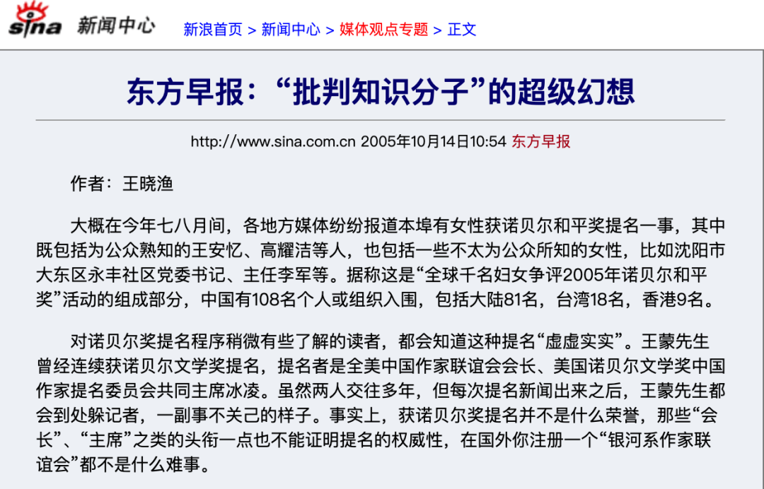 第二天,群友终于联系到了周筱赟的家人,看到了一份抬头为盘锦市公安局大洼分局、落款时间为2021年8月1日的通知书,告知周筱赟因涉嫌寻衅滋事罪于2021年7月31日18时被执行指定居所监视居住。后面的事情,很多人都知道了。值得一提的是,在警方通知的周筱赟被抓时间(7月31日18时)之前,群友其实已经打他电话没人接了。我记不太清是哪一年因为什么事情跟周筱赟认识的了。如果印象没错,应该是2005年我还在《东方早报》的时候,他主动来联系一件事。当年七八月份,国外有机构发起了一个“全球千名妇女争评2005年诺贝尔和平奖”的活动,国内诸多机构如《读书》杂志、《天涯》杂志等,以及诸多名人如汪晖、戴锦华、韩少功、高耀洁、王安忆(后被证明她本人并不知情)等都卷入其中,香港岭南大学刘健芝教授是该活动的中国(和蒙古)地区负责人。这事情应该不假。说起来无非是根据诺奖的评选规则,向诺奖推荐人选。只要有推荐资格的,都可以这么做。问题是组织工作做得太差了,过程中出现种种不合理的地方。比如向被推荐的人选收取到丽江开会的差旅费,甚至要求被推荐人出赞助费。这让高耀洁老人起了疑心,宣布退出这个活动。结果,主办方很硬气地表示,一经推荐就不得退出。这下子惹火了不少人。▲王晓渔在《东方早报》评论版发表的文章(图/网络)《东方早报》评论版介入此事,应是从10月14日发表同济大学老师王晓渔的一篇质疑文章开始的。当时,该年度诺贝尔和平奖名单已经揭晓。这篇题为《“批判知识分子”的超级幻想》的文章里,王晓渔指出了该活动的种种荒谬之处,称之为一场“闹剧”。这篇文章引起了很大反响。很快,汪晖教授本人也向《东方早报》投书回应此事。稿子是报社其他同事转来的,我们拜读后决定原文刊发。不过,汪晖教授并没有谈到推荐和组织过程的问题,而是再次重申了这项活动的意义。随后,事件的当事人之一高耀洁老人也在《东方早报》评论版上发表文章,解释她为什么要退出这项活动。如果我记忆无误的话,高耀洁的文章应是周筱赟联系和推荐过来的。那段时间,周筱赟在某家出版社任职,编辑出版了高耀洁老人的一本书(《中国艾滋病调查》,周筱赟是该书编辑)。那时候,我也才偶然知道他是葛剑雄教授的博士生。葛老师是《东方早报》评论部的“老熟人”,经常给评论版撰稿,上至国家大政,下至身边小事,无所不谈,笔锋甚健。葛老师一贯不用手机,交流想法都是通过打电话,有时候电话里聊数分钟,没过多久他的大作就发过来了。评论部的同事都很喜欢葛老师,往往他的作品发过来,大家都会就着相关话题展开讨论。▲当年周筱赟发表的文章《为何历史总是如此相似》(图/网络)