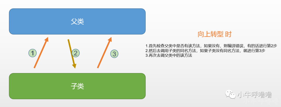 由此我们可以知道当发生向上转型,去调用方法时,首先检查父类中是否有该方法,如果没有,则编译错误;如果有,再去调用子类的同名方法。如果子类没有同名方法,会再次去调父类中的该方法