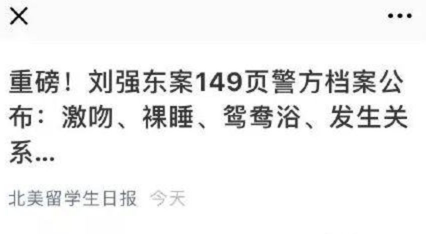 北美留学生日报当时推送的文章标题为《重磅!刘强东案149页警方档案公布:激吻、裸睡、鸳鸯浴、发生关系…》,文中的表述为“记录显示是女方主动邀请刘强东去她新搬的公寓,并且两人曾在车内激吻,同时,在回到公寓后还同洗鸳鸯浴,性交后熟睡数小时……”