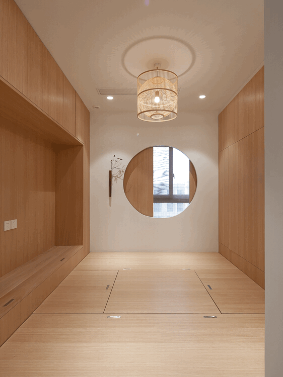 ⭐好用窍门:整个榻榻米空间打造成茶室,三五好友,饮茶插花,阅读谈天。升降台面配合中式圆窗,让休闲区域变得更有格调,可储物、可娱乐、可休憩,用途多多。