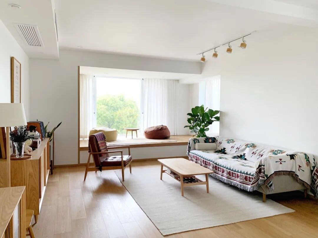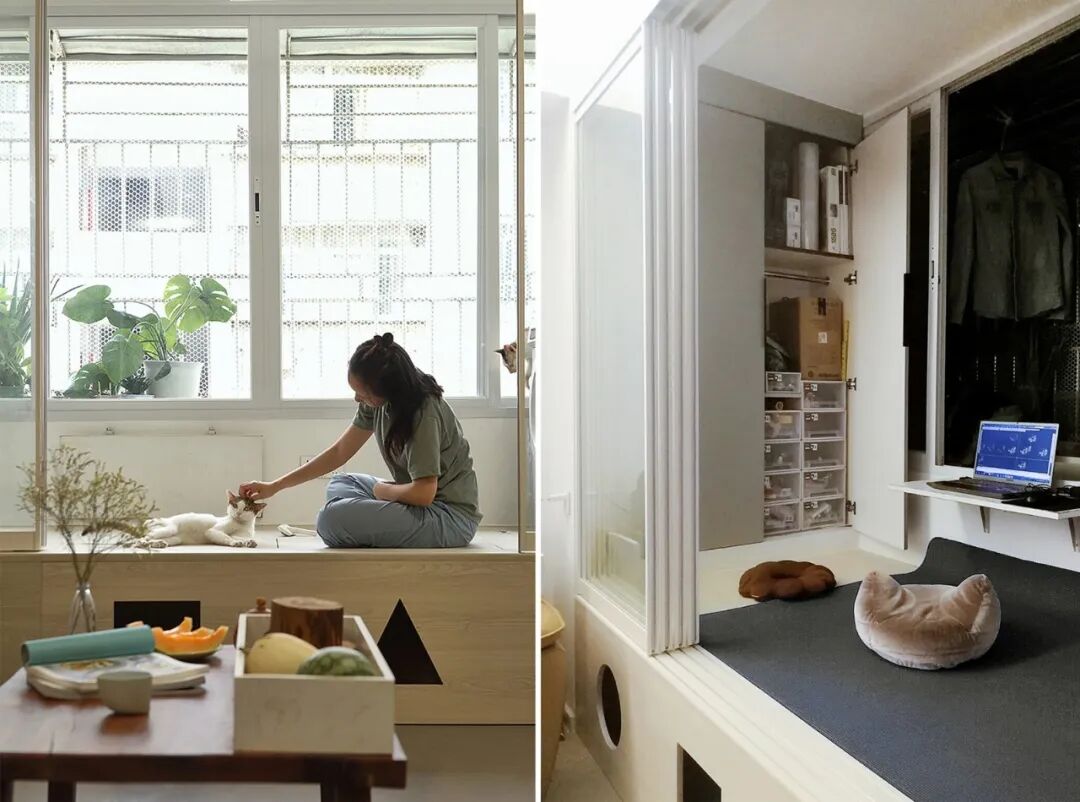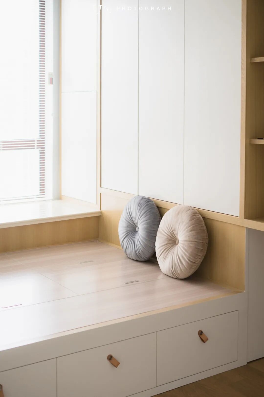 ⭐好用窍门:大窗户+榻榻米阳台,吸收足够光照,榻榻米下方开个猫洞,不做储物,满足猫猫的躲藏欲,成了人与猫放松玩耍的趣味空间。