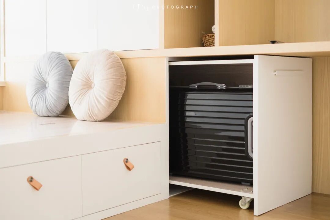 ⭐好用窍门:高柜下方装抽屉,鸡肋位置也能利用率max,塞进不常用的大件行李箱,屋里看着更整洁。