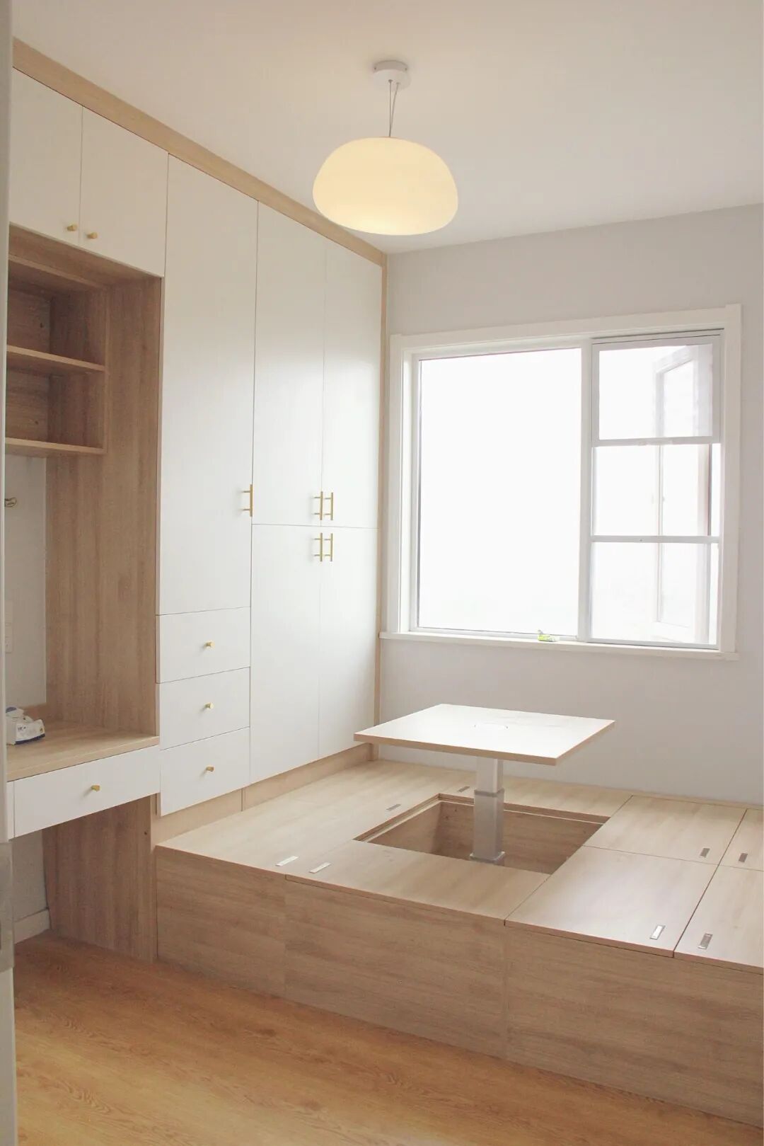 ⭐好用窍门:卧室太小,抬高地面做成榻榻米地台,增加收纳,还哪儿哪儿都能躺,最适合小户型和mini卧室了。但是家里安装地暖的,糖主就不建议做成储物空间咯,否则对里面的物品也并不友好。
