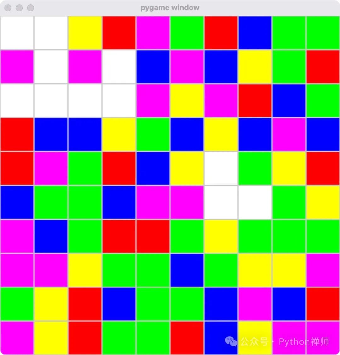 更令人惊艳的是,本程序可以直接运行,且还可以展示游戏界面,但可惜的是,核心函数 check_and_remove() 逻辑中,检测和消除相邻颜色方块的是个死循环,游戏无法玩,只能看看主界面。