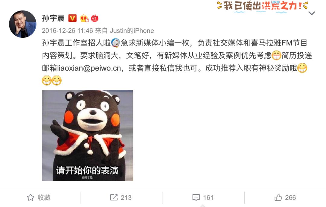 孙宇晨的微博开设于2011年,目前能找到最早的微博发自2014年12月5日,转发了非你莫属节目的官方微博。这是一档老板和面试者共同参与的求职节目,孙宇晨是最年轻的“Boss团”成员。尽管上节目花了钱,但这个“最年轻”成了孙宇晨很不错的一个公关发力点。