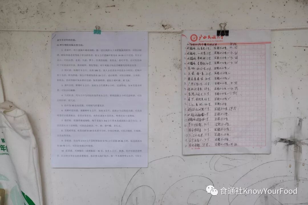 〇挂在墙上的水稻生长记录本(右),与生物防治病虫害的方法(左)。