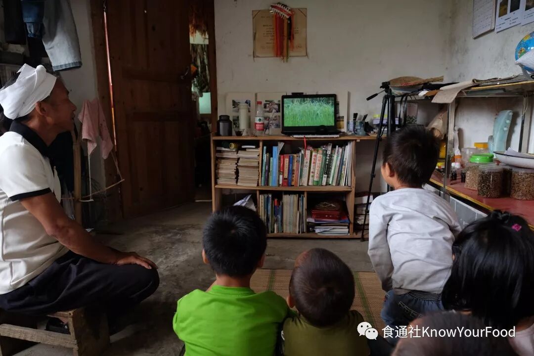 〇给孙子们看自己拍的水稻纪录片。