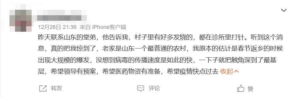 最近,在河南的乡村,类似的情况并不少见。事情的进展,似乎远比我们想象中快。不少身在大城市的年轻人发现,即使地方不同,他们都有家乡的亲戚一度发烧、咳嗽。