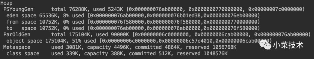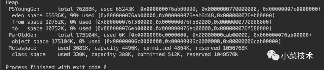 我们得到bt1新建以后,我们的堆内存几乎占满了,现在已经99%了,那么我们再来看一下。public class Main { public static void main(String[] args) { byte[] bt1,bt2; bt1 = new byte[60000 * 1024]; bt2 = new byte[10000 * 1024]; }}