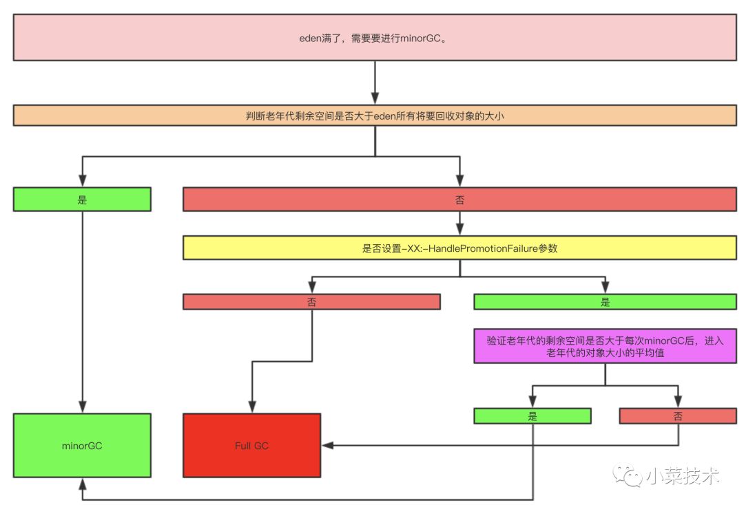 我们设置了参数,声明10M的对象就为大对象,我们创建了一个大概20M的对象,就直接放置在了老年代上。就是对象经历那么多次的minorGC了,jvm虚拟机会认为你可能会一直存活,趁着这次放不下了,你就趁早过来吧,来我们老年代混吧。 其实我们每次进行minorGC前,会有一系列操作的,可能会进行full GC的,那么我们来看一下流程吧。