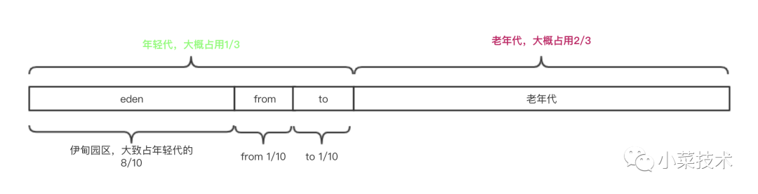 如果都为默认设置,大致就是这样的。假设我们设置内存堆的大小为600M,那么老年代就大概是400M,我们的年轻代就是200M,然后年轻代的eden区域占160M也就是200M的8/10,一般新建的对象都在这,我是说一般啊。后面会用这个600M来详细说明,from和 to区域各占20M,也就是Survivor区域占用40M,每次做完minor GC,对象就放在这个区域。