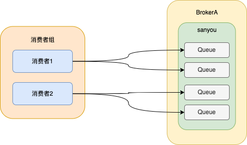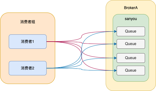 如图所示,将每个队列分配只分配给同一个消费者组中的一个消费者,这样消息就只会被一个消费者消费,从而实现了集群消费的效果。
