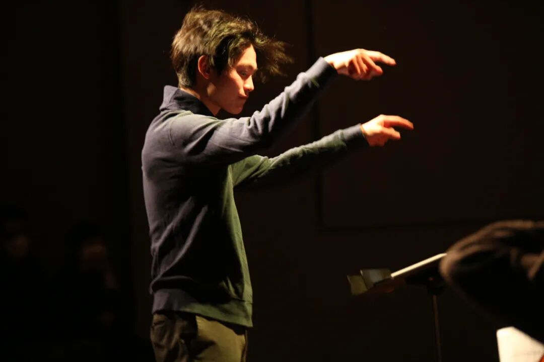 《风语者》是邵跃哲专门为这场音乐会创作的,“风代表着自由、创造和理想主义的先锋,代表着没有束缚和框架,能打破常规,承载着我们的思绪与思想到达世界上的每一个角落。”在这部作品中,他从“风”的意象出发,来描绘一个能懂“风儿”语言的使者。然而首次排练,作品就因为谱面过于复杂,给排练带来了困难。“当时指挥不得不跳过这个作品,继续排练其他作品。”邵跃哲回忆,排练结束后金郁矿找到他,为他讲解了许多如何把复杂的音乐以最简明的方式体现在谱面上的方法,以便乐手们更好地理解。当晚回去后,邵跃哲对作品进行了大幅调整,“这次与乐团合作,我更清楚了怎样写作才能让作品顺利地被演出。感谢金郁矿,没有他的发起就没有我们青年学子作品的亮相。”