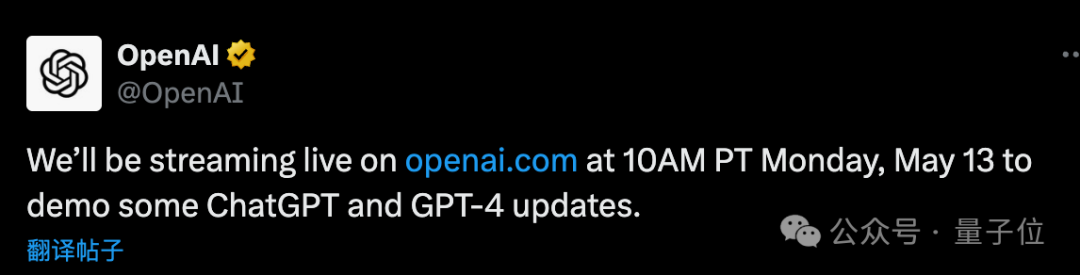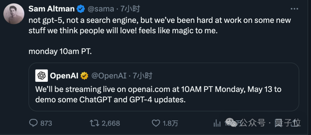 奥特曼最新宣布:5月13日开发布会,不是GPT-5,也不是盛传的GPT搜索引擎,改成对ChatGP和GPT-4的升级~