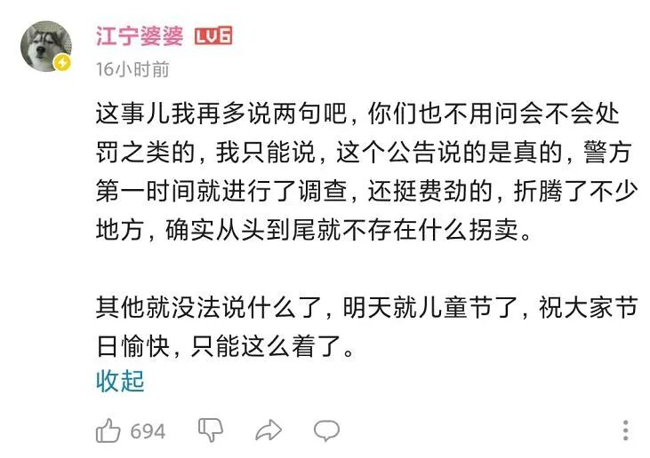 整件事就此落下帷幕,目前警方没有给出进一步说明,不过@江宁婆婆(南京市公安局江宁分局网安大队副大队长)在上述公告底下回复说该公告为真,且警方为了调查整件事,费了很大力气,但从头到尾就没有发生过拐卖。