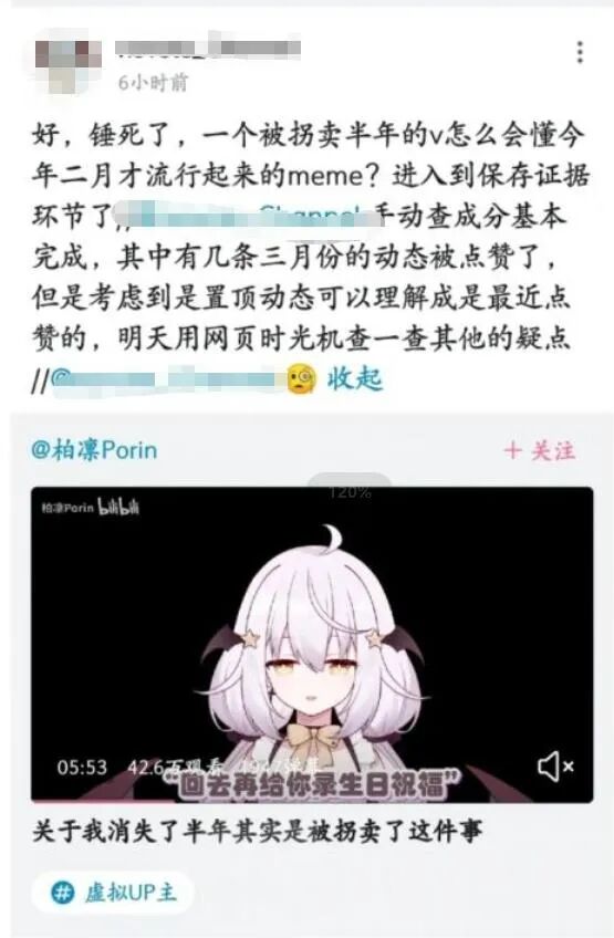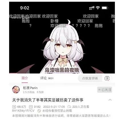在5月21日,一个叫柏凛Porin的vtb发布了一则视频,名叫《关于我消失了半年其实是被拐卖了这件事》。其内容就如标题所示,这名虚拟主播在视频里解释说自己之前(从网上)消失半年,是因为被拐卖了。