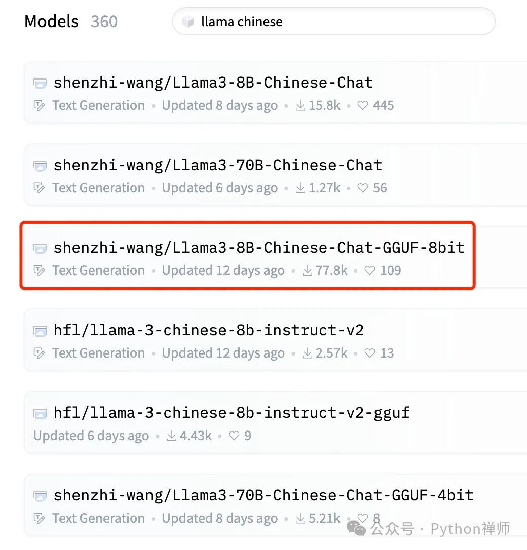 在模型列表页面按照关键字llama chinese搜索,并按照趋势排序,可以看到中文版模型: